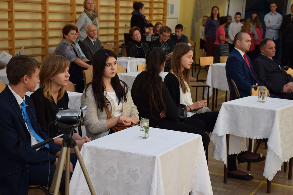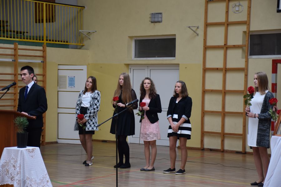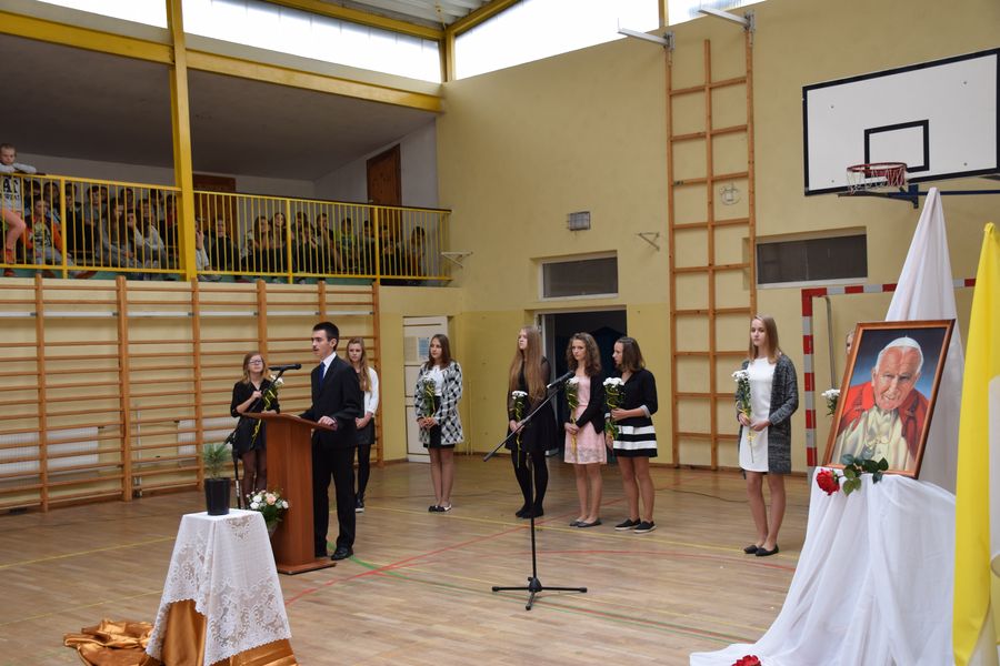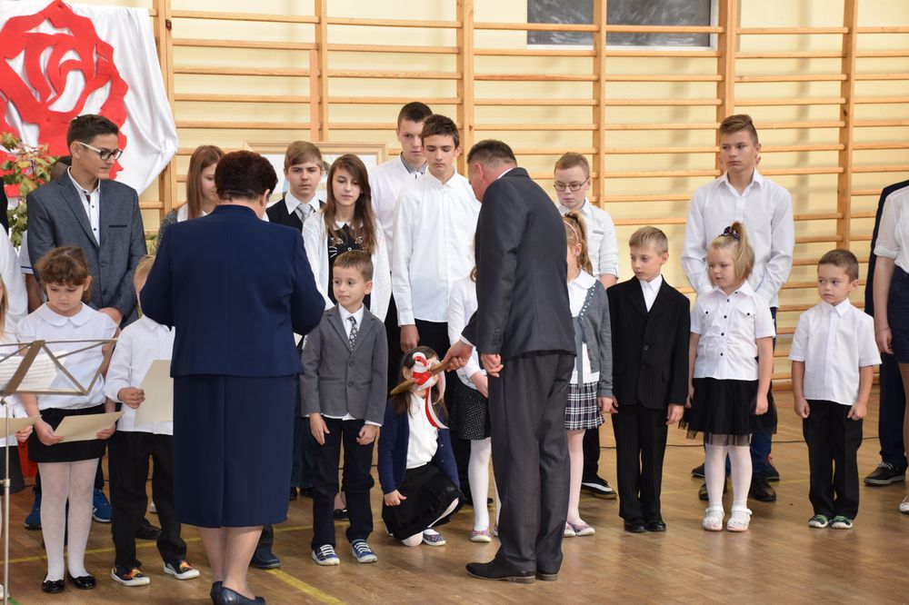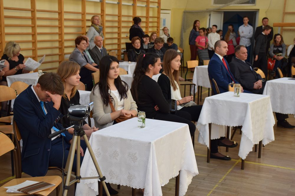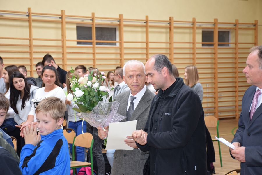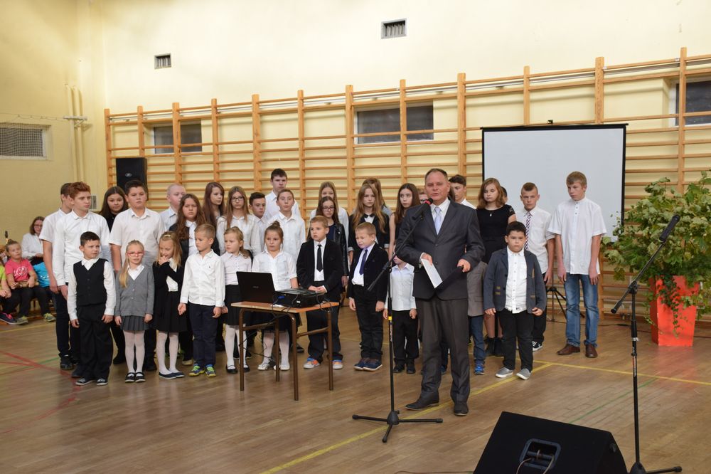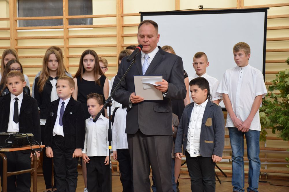 Pierwszym elementem programu było wystąpienie dyrektora szkoły Pana Dariusza Mielniczuka, który nie kryjąc wzruszenia, dziękował rodzicom, uczniom i wszystkim pracownikom szkoły za miniony rok pełen sukcesów. Z satysfakcją bowiem możemy się pochwalić wysokimi wynikami egzaminu gimnazjalnego, które są zasługą pracy całego zespołu.