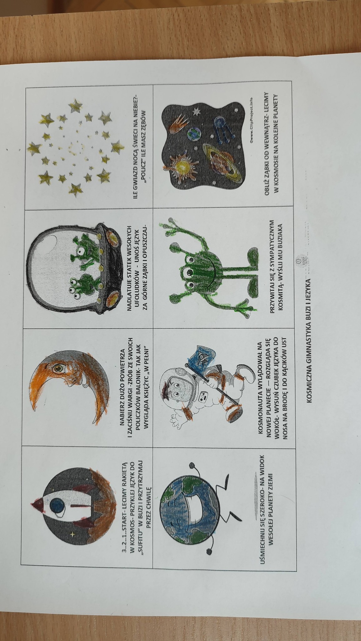 Styczeń upłynął nam pod hasłem kosmosu. Uczniowie wykonywali zadania ruchowe, jednocześnie ćwicząc artykulatory, np. „startowali i sterowali rakietą”, „oddychali jak kosmonauci” czy odtańczyli „kosmiczny taniec”.