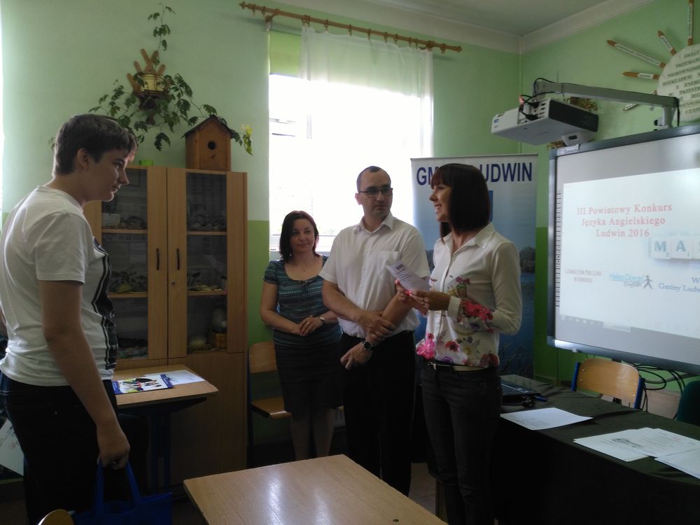 Słowa uznania należą się Dominikowi, który pokonał uczniów gimnazjów powiatu łęczyńskiego z Gimnazjum nr 2 w Łęcznej, Gimnazjum w Cycowie, Gimnazjum w Puchaczowie, Gimnazjum w Ludwinie, zdobywając I miejsce oraz opiekunowi językowemu, Pani Joannie Zielińskiej za przygotowanie ucznia do konkursu.